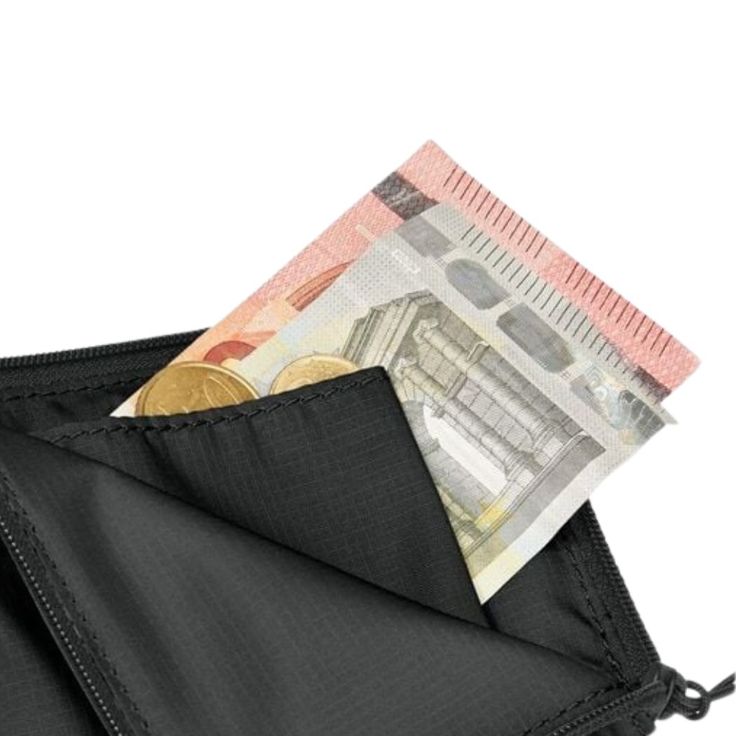 The WANDERMOOD WALLET is a compact, secure wallet ideal for travel. Room enough for essential identification and currency, this wallet is primed for secure organization with one external attachment loop and a zippered pocket that closes entirely. Made with CROSS RIP fabric, this wallet is rugged while remaining flexible.